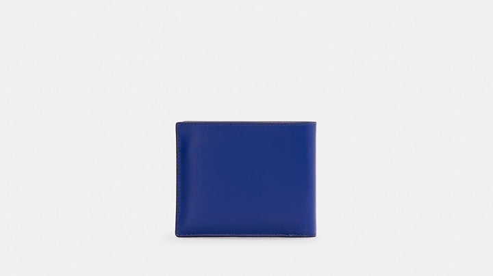Wallet is blue outside / gold inside with 8 card slots and full-length compartment for $